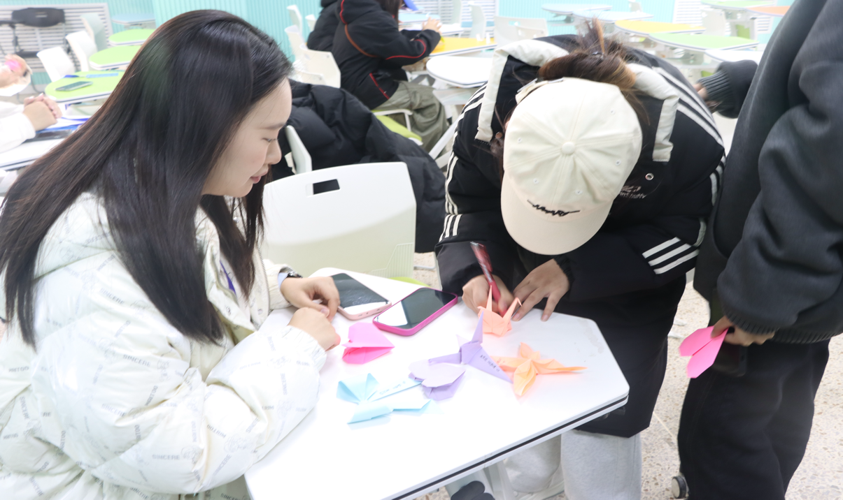 随着活动正式启动,同学们依次进入创作场地,迅速投入到折纸创作中。指尖翻飞间,普通的纸张被赋予生命与创意,化作灵动的飞鸟,变为精致的花卉,每一件作品都凝聚着创作者的巧思与耐心。