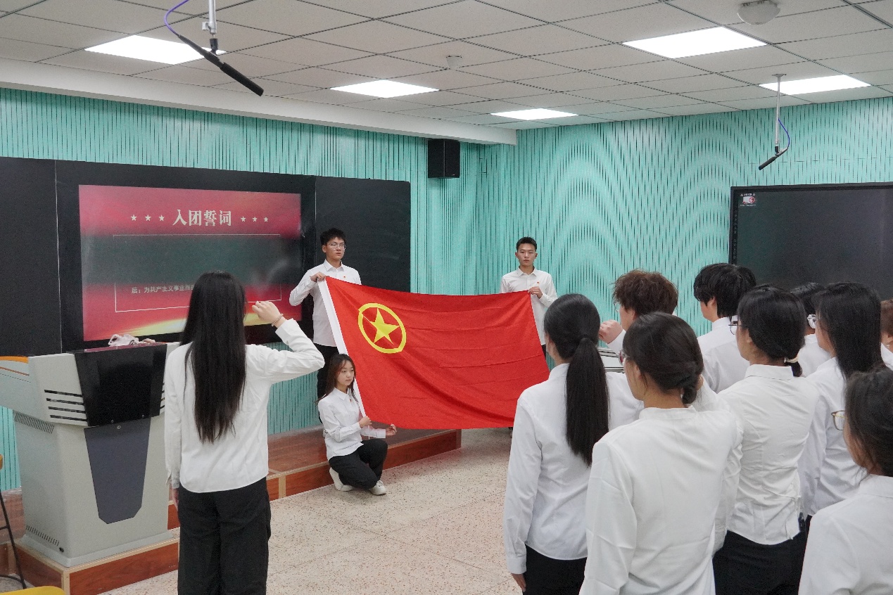 在23级新媒体一班王虹懿的领誓下,全体新团员面向团旗,高举右拳,庄严宣誓。