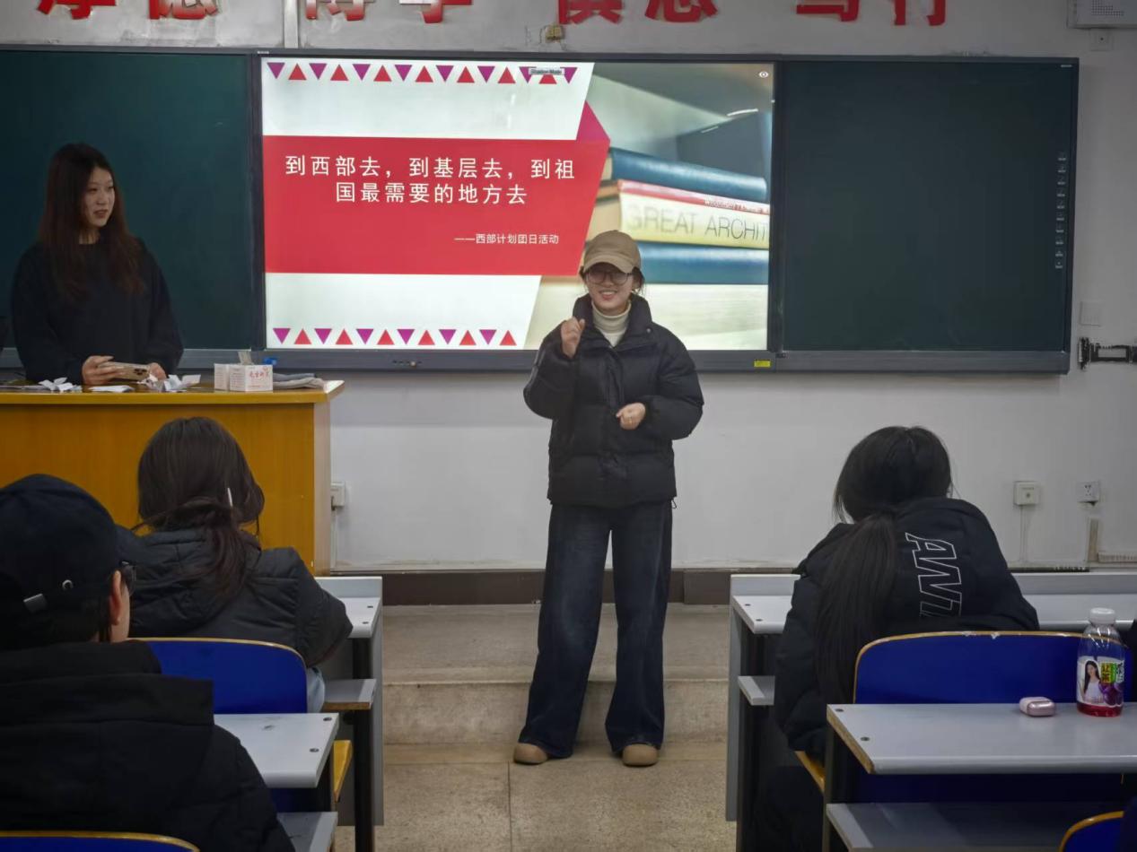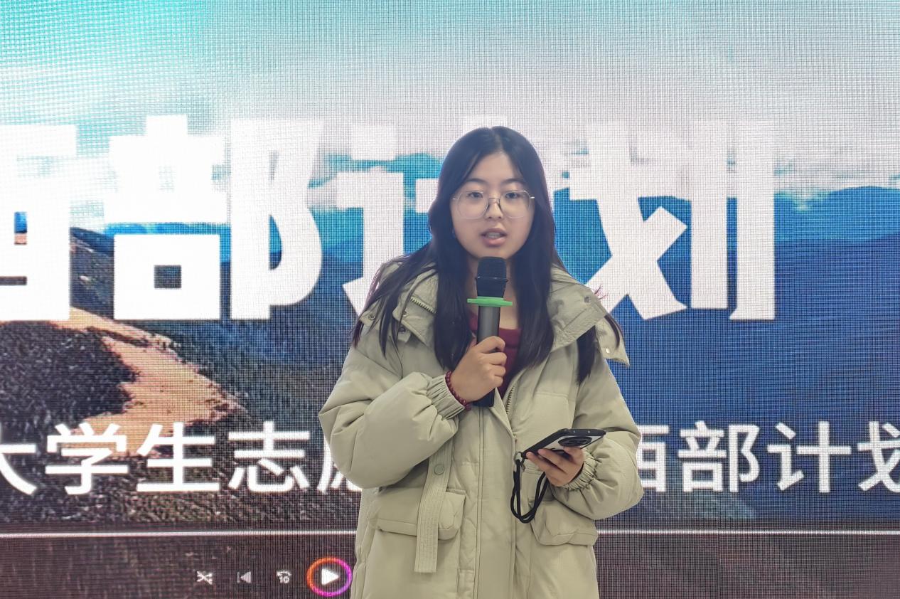 团委干事刘嘉敏号召青年投身西部建设,她指出西部计划的深远意义在于紧扣国家重大战略,填补西部基层人才短板,弘扬志愿精神。同时,她也表明志愿者可享生活补贴、社保、考公考研加分等支持。随后,她通过支教志愿者高潮的故事展现了奉献价值与教育成效,积极倡议青年将个人理想融入国家发展。